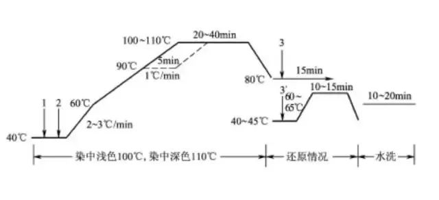 預定形( 視織物規格而定)→ 前處理→染色→還原清洗→烘干→后定形→整理